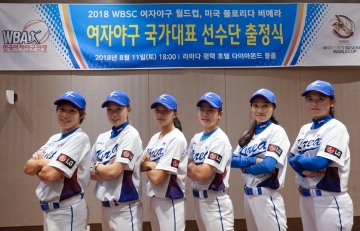 LG전자가 22일부터 31일까지 미국 플로리다에서 열리는 ‘2018 WBSC 여자야구월드컵’에 출전하는 대한민국 국가대표팀을 후원한다. 11일 출정식에서 국가대표팀 선수들이(왼쪽부터 이빛나, 안재은, 신정은, 염희라, 박수빈, 김보미 선수) 대표팀 유니폼을 입고 포즈를 취하고 있다.